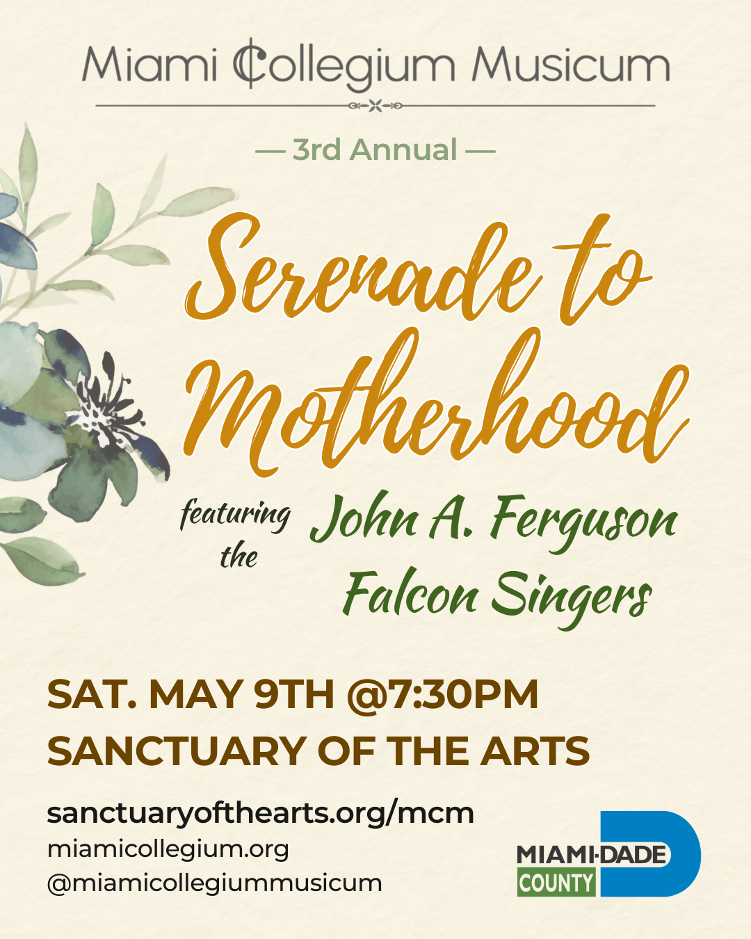 Sanctuary of the Arts 410 Andalusia Ave, Coral Gables, FL, United StatesJoin us at 7:30pm on Saturday, May 9th for our 3rd Annual Serenade to Motherhood! This year, we are happy to feature Angelo Marchese’s Falcon Singers from John A. Ferguson High…